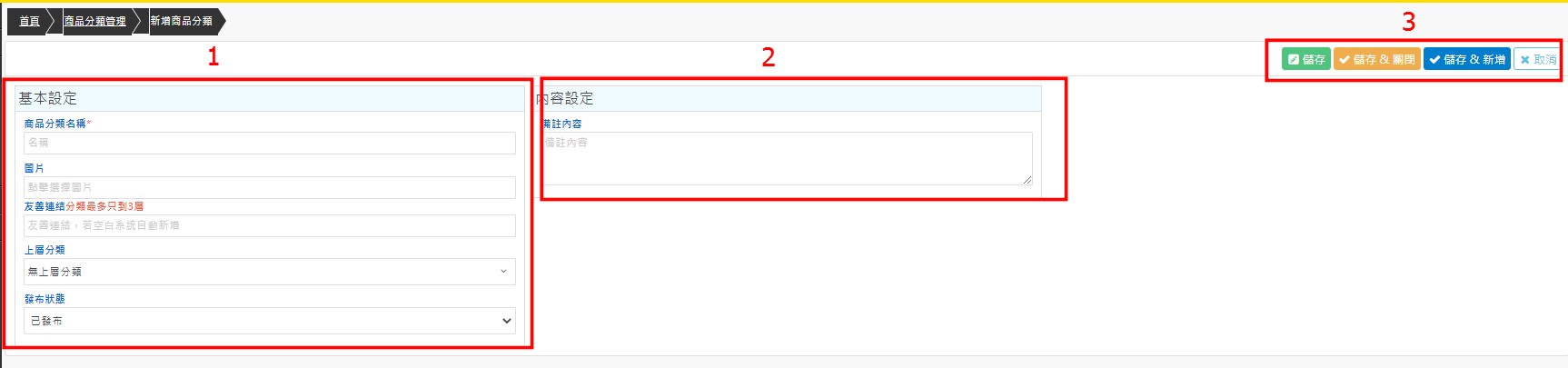 產品管理>商品分類管理>點「新增」後(如下圖)
