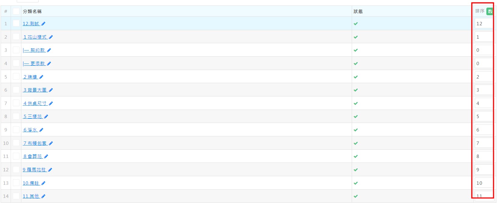 - 建立完商品分類後記得調整排序並按