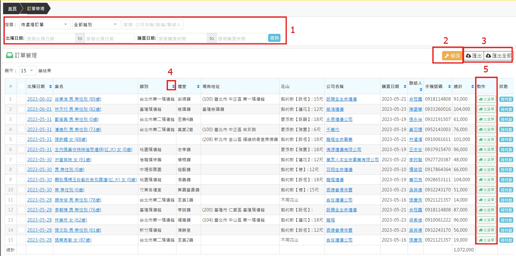 4-1、出殯日期、購買日期: 點選下->由舊至新,點選上->由新至舊。