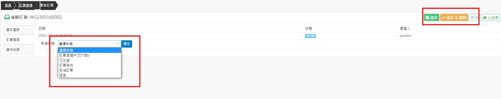(1)、變更訂單狀態: 於訂單進度內選擇訂單狀態,按儲存即可變更訂單狀態。