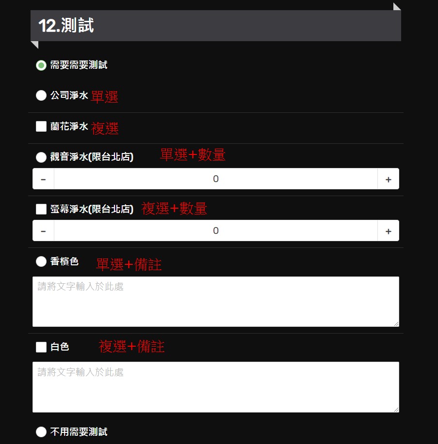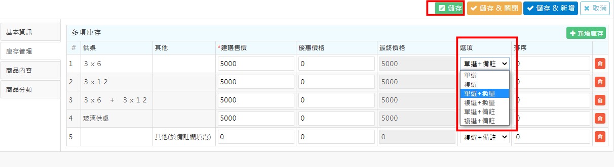 修改選項類型 (1花山、3背景大圖、9羅馬花柱、10備註為固定形式不可變更。) 舉例: 單選便複選,或單選變加數量或備註 操作流程: 產品管理>商品管理>搜尋分類>選擇欲修改之選項>庫存管理-調整選項(圖1)>儲存(圖1) (前台顯示畫面請參考圖2) 圖1 庫存管理-調整選項>儲存 圖2 前台顯示畫面請參考