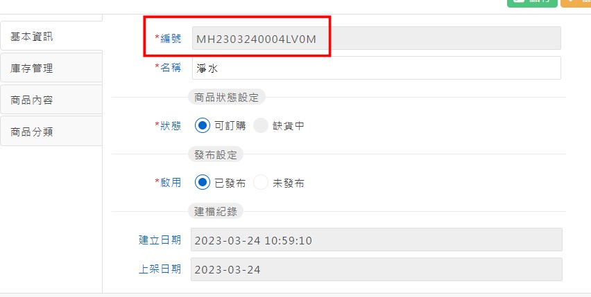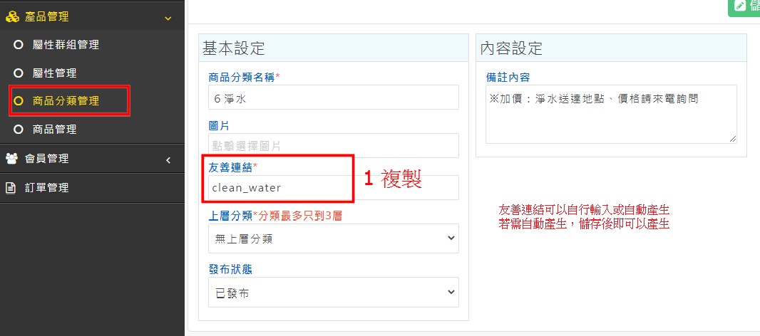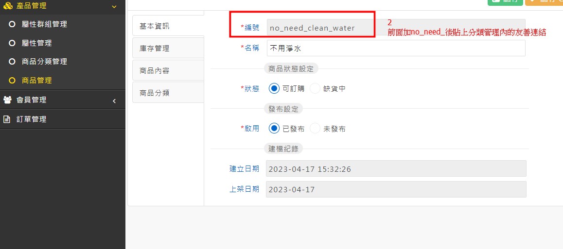 不用淨水: 名稱打不用淨水即可,編號處自行輸入,一定要有no_need_+商品分類管理內所屬分類的友善連結(如下圖2)
